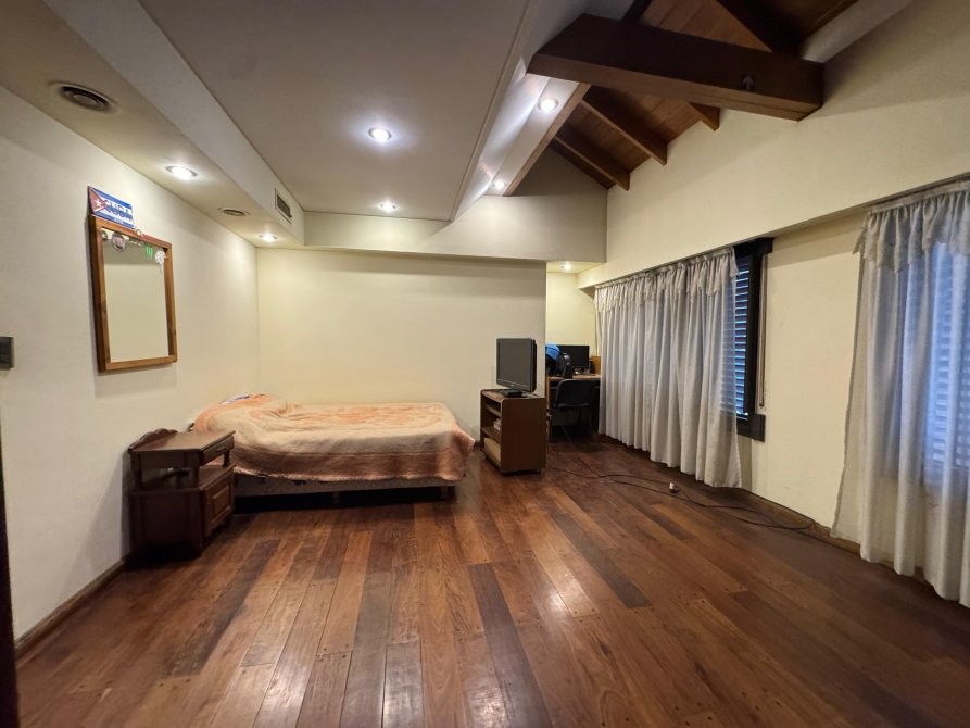 La propiedad se desarrolla en 3 plantas y cuenta con salida a dos calles. En la planta baja cuenta con un living comedor con hogar a leña, cocina equipada con alacenas y muebles bajo mesada, dos dormitorios, baño completo, dormitorio y baño de servicio, Jardín, quincho con baño y cuarto de servicio, pileta de fibra con su caldera y equipo de filtro. Cuenta con garage para 3 autos y sobre calle Ducasse garage para otros 2 vehículos con portón automatizado de apertura rápida. Los pisos en esta planta son cerámicos. La planta alta cuenta con 3 dormitorios, dos de ellos amplios, con baño compartido y el dormitorio principal en suite que cuenta con vestidor. En la ultima planta se encuentra el Playroom. Los pisos en estas dos plantas son de parquet y se encuentran en excelentes condiciones.