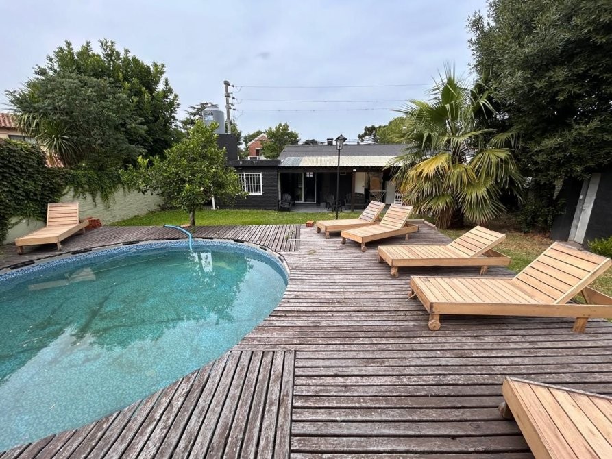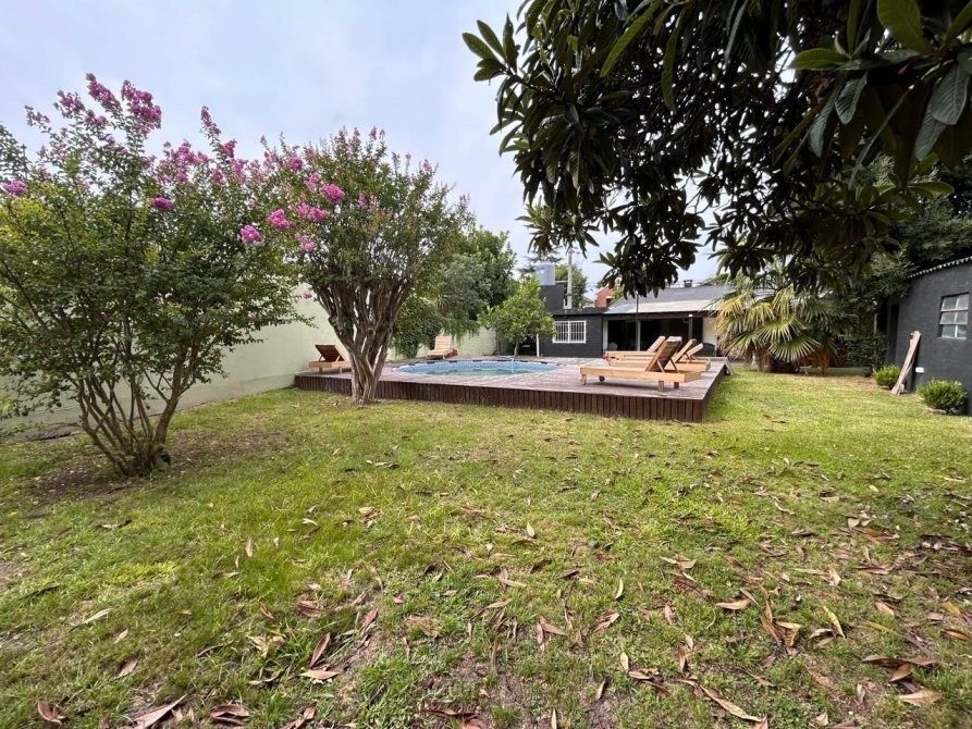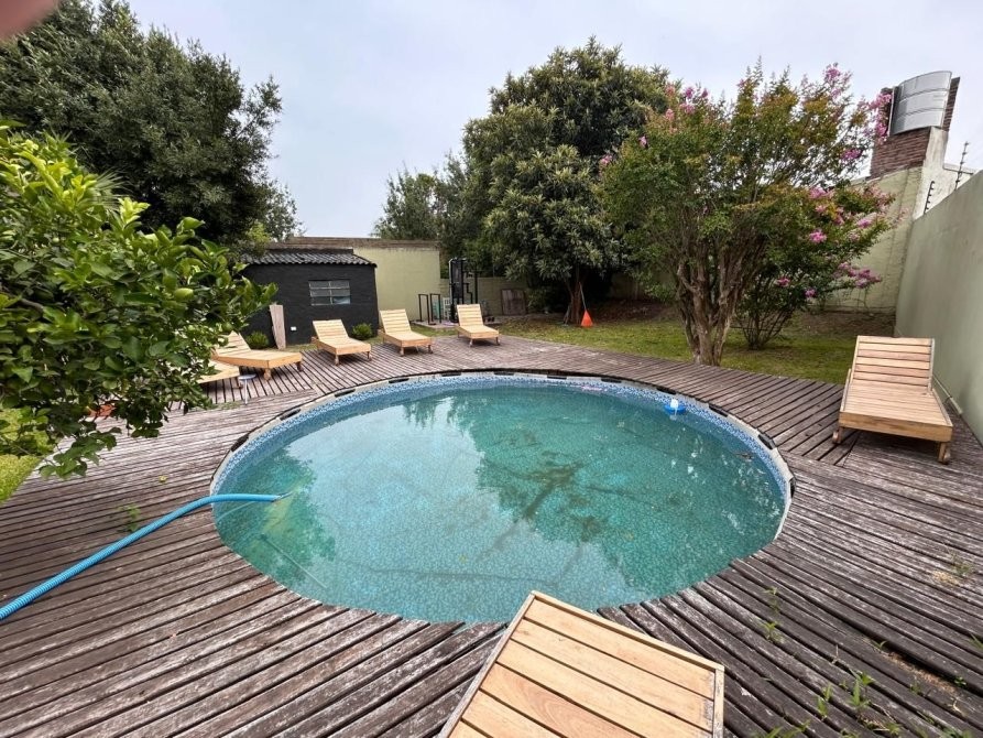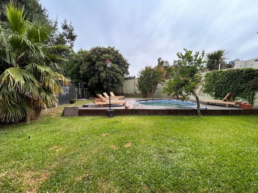 Al exterior, se destaca un hermoso patio con galería semicubierta, parrilla y cuarto de herramientas, acompañado por un jardín con riego por rociadores y una pileta tipo pelopincho con deck de madera, ideal para el disfrute al aire libre.