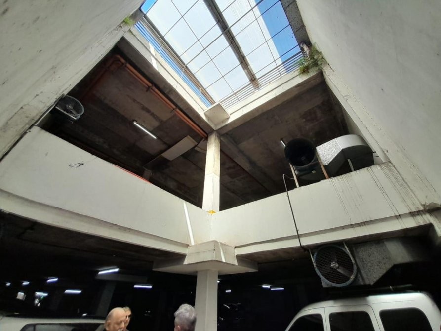 Como basamento del edificio se desarrolla un garage de gran escala, actualmente en pleno funcionamiento: