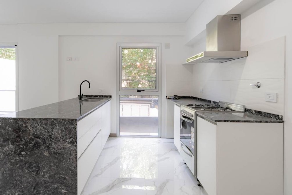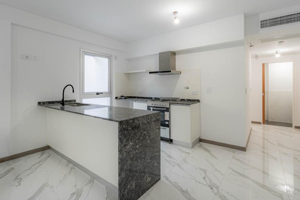 - Cocina semi - integrada con mesada de mármol y muebles bajo mesada