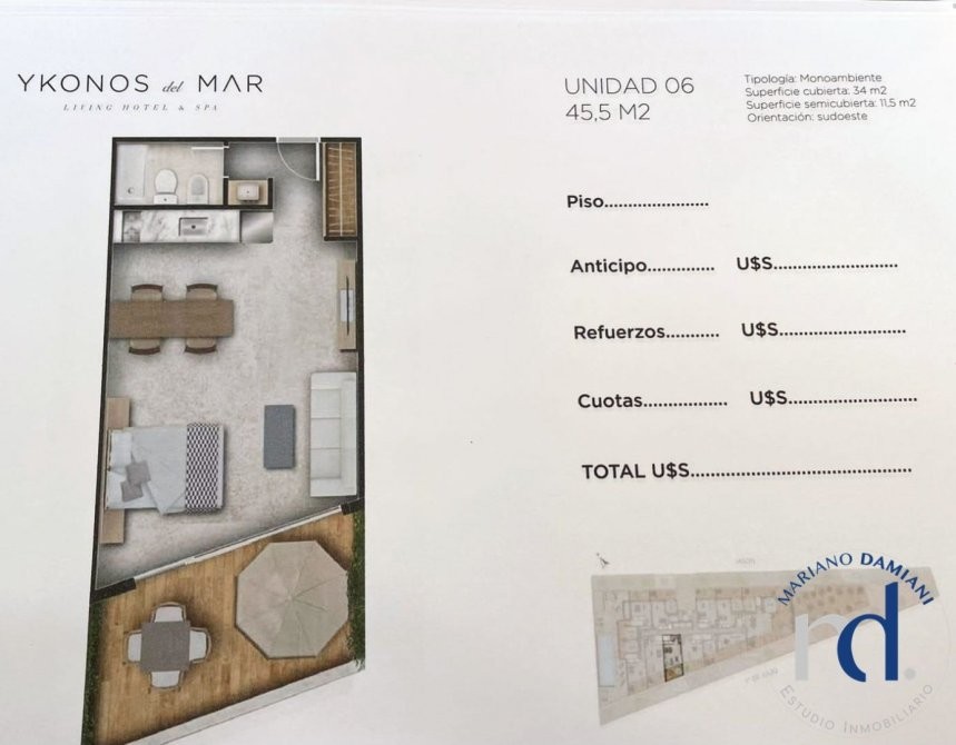 Ykonos de Mar 1º 104, imponente monoambiente ubicado en el centro de la ciudad y cerca de las playas de la misma.