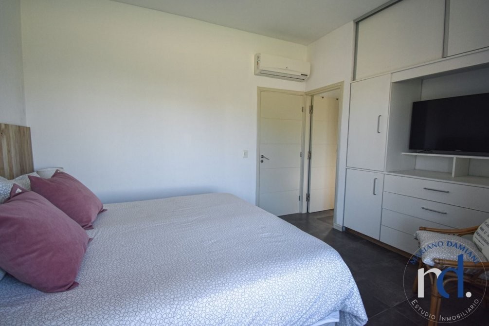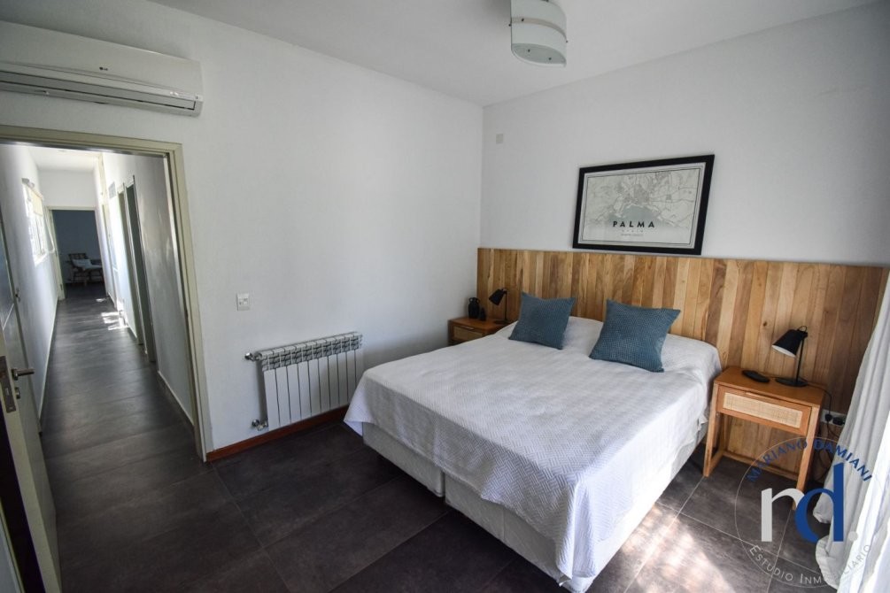 - Dormitorio principal con cama matrimonial en suite con aire acondicionado y salida al jardin.