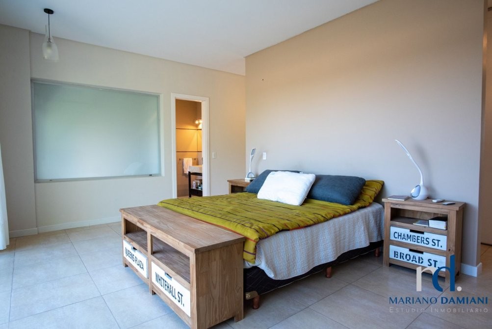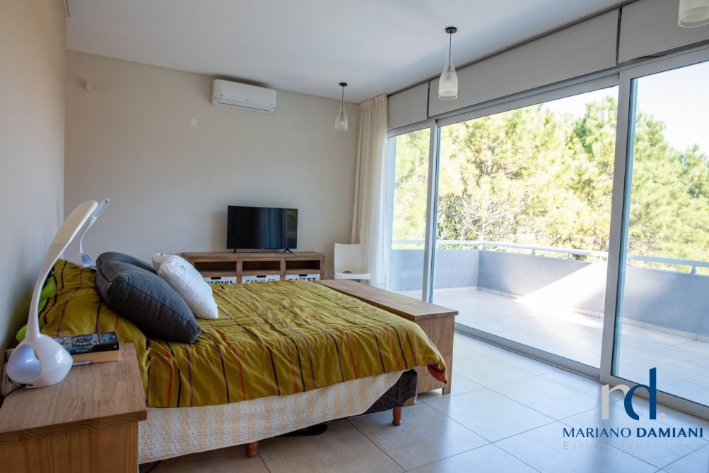 - Dormitorio principal con cama matrimonial en suite con aire acondicionado,  balcon con vista al jardin y a la cancha de polo.