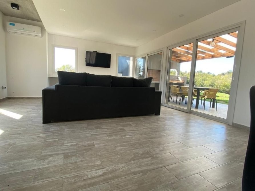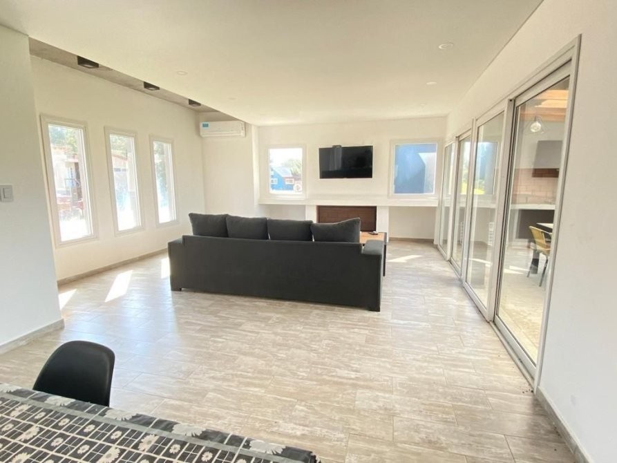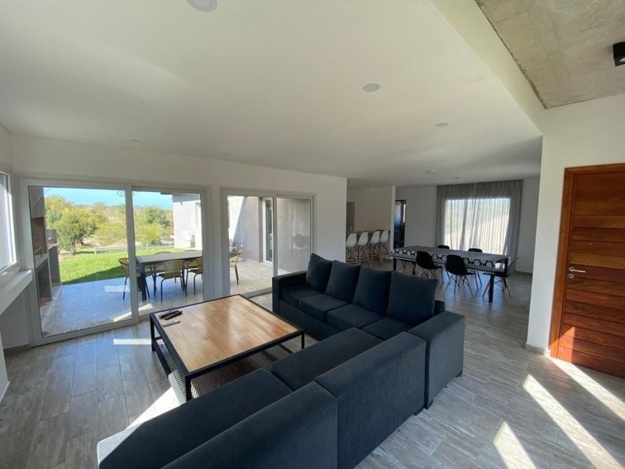 La construcción de 200 m2 se distribuye comenzando con un amplio living comedor con salida al quincho semi cubierto.