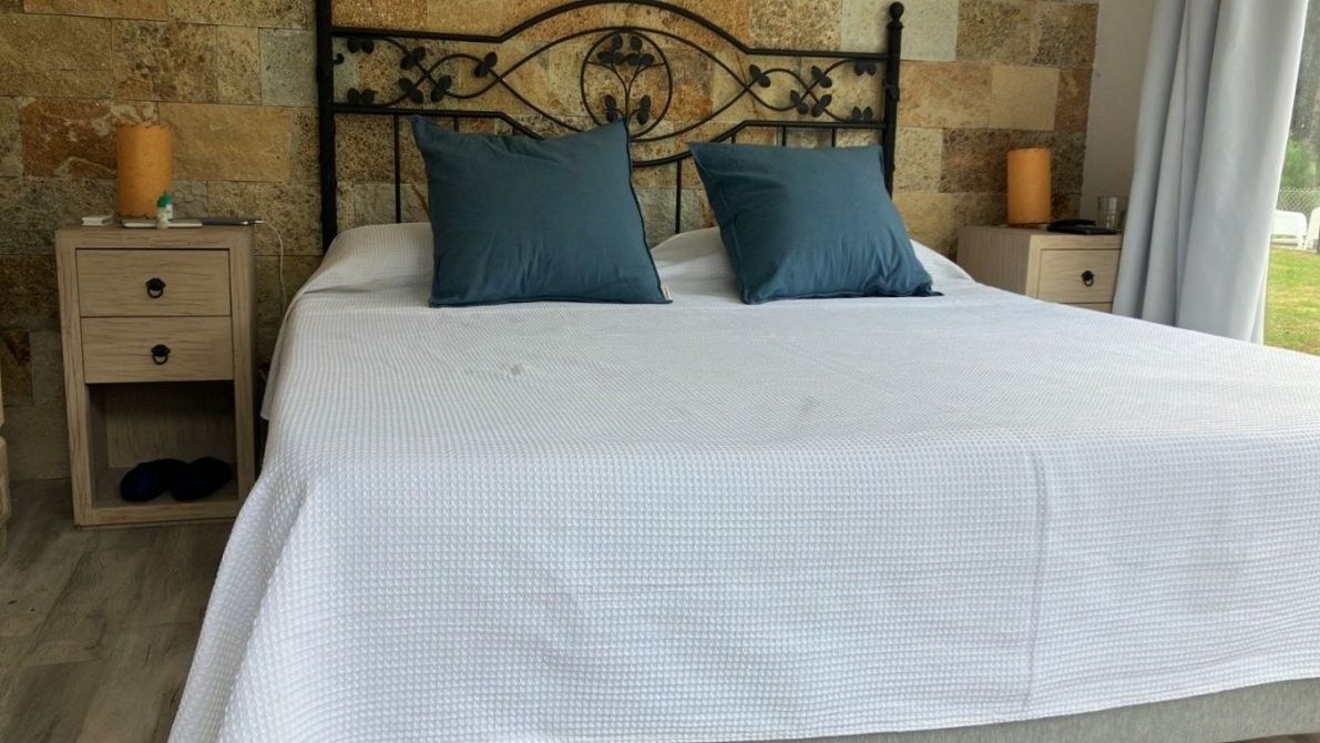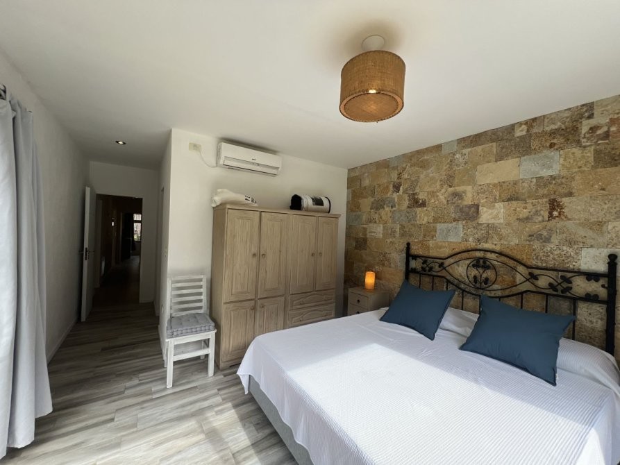 - Un dormitorio en suite con una cama matrimonial, cuenta con aire acondicionado.
