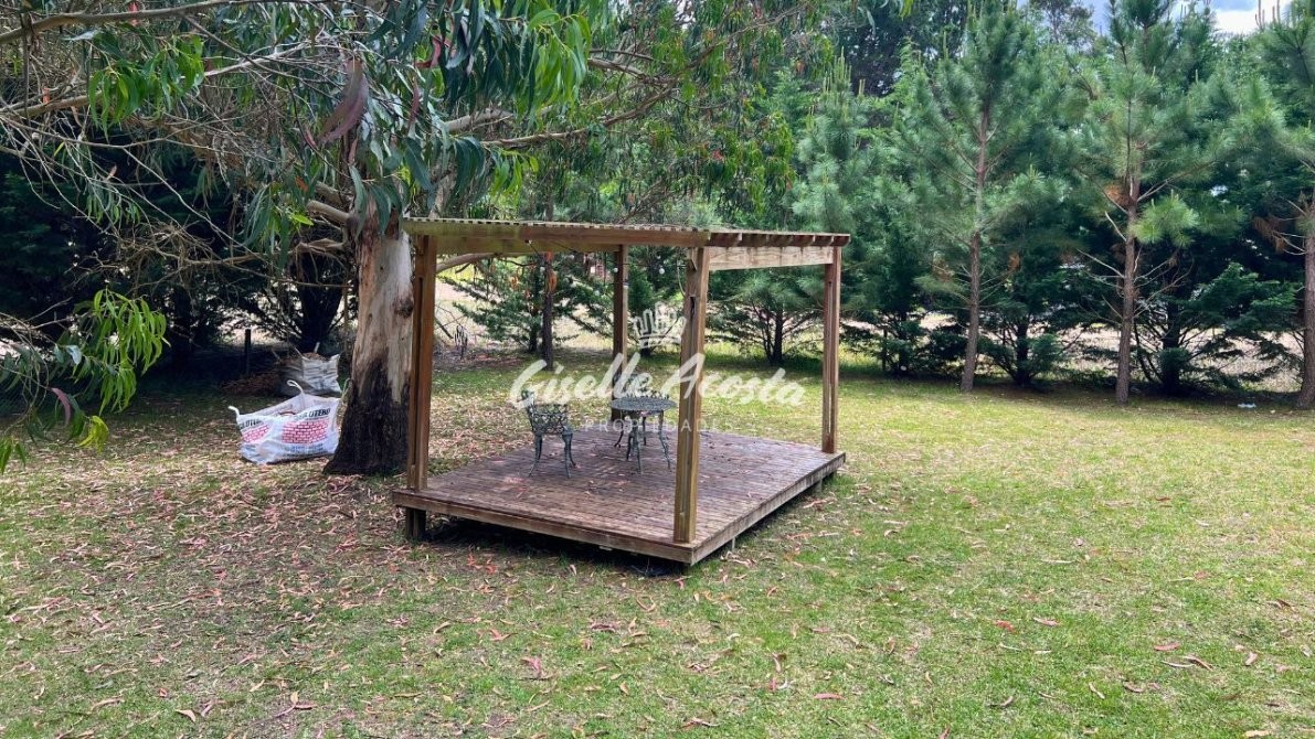Jardín trasero con casa de madera para niños y un lote totalmente parquizado.