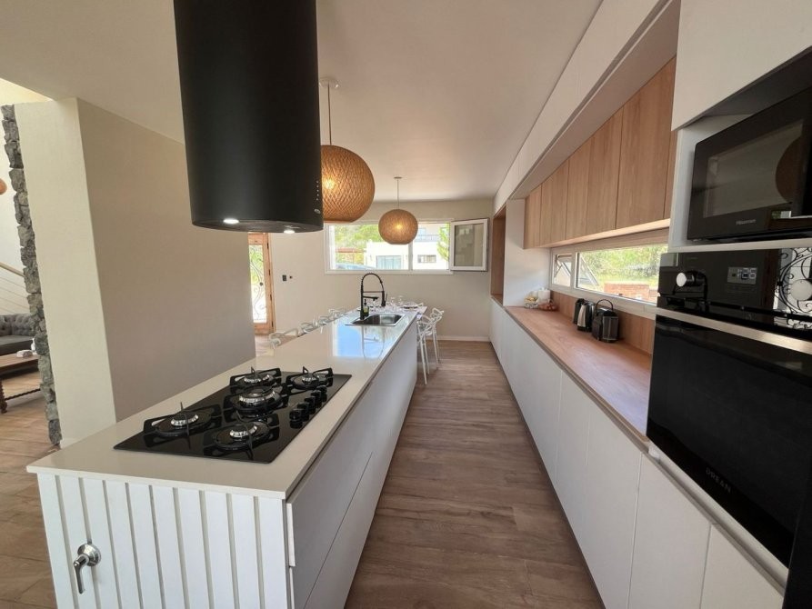 Cocinacomedor integrados con barra desayunadora, lavavajillas, heladera No Frost, cocina, microondas, pequeños electros.