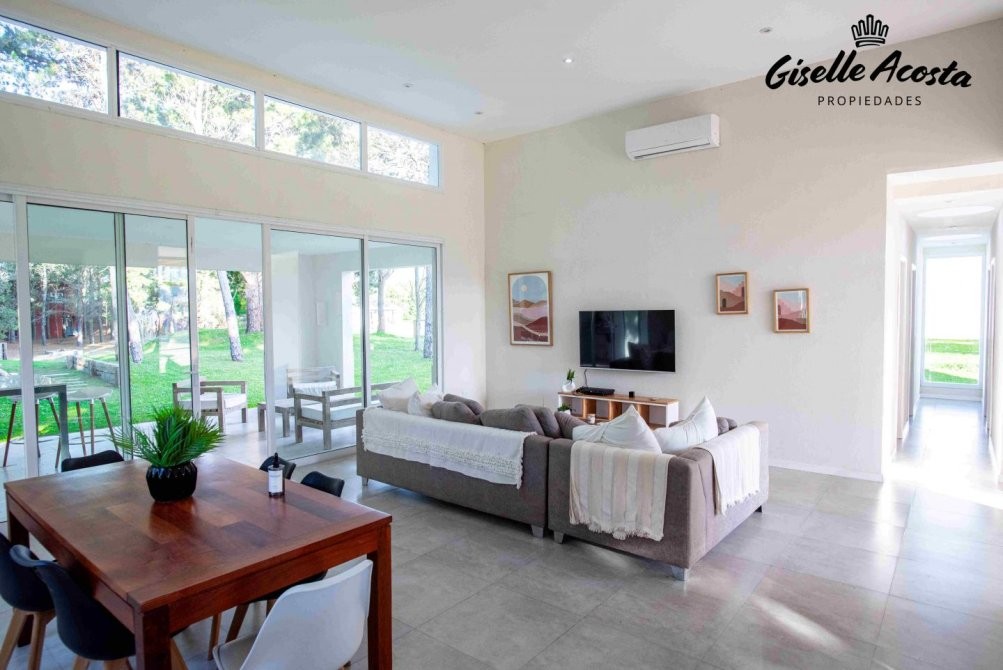 La casa es continúa, en su exterior con una galería cubierta con parrilla. un entorno maravilloso de bosque parquizado una parte y otra agreste prolijamente acondicionada y con riego programado.