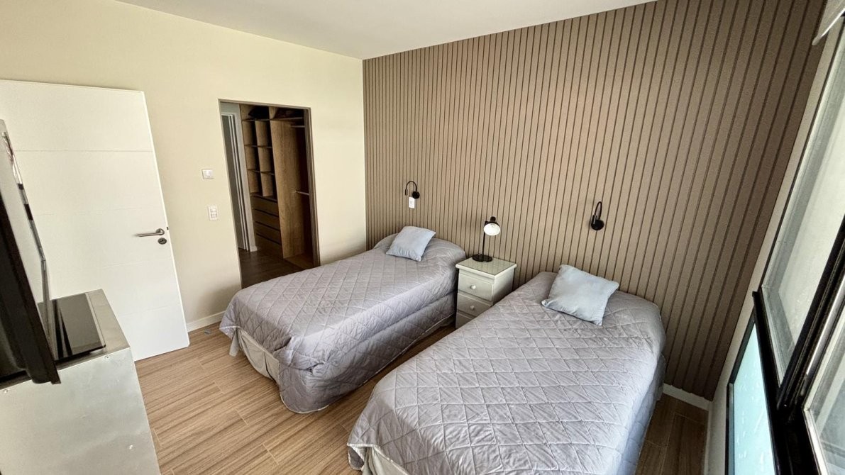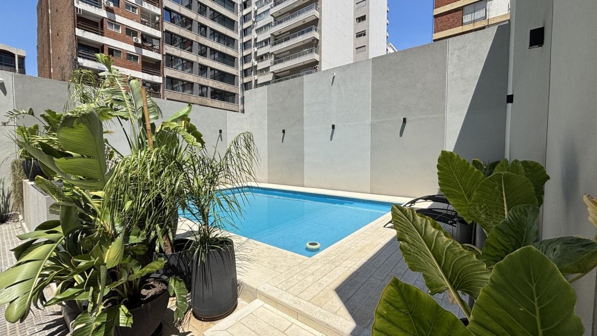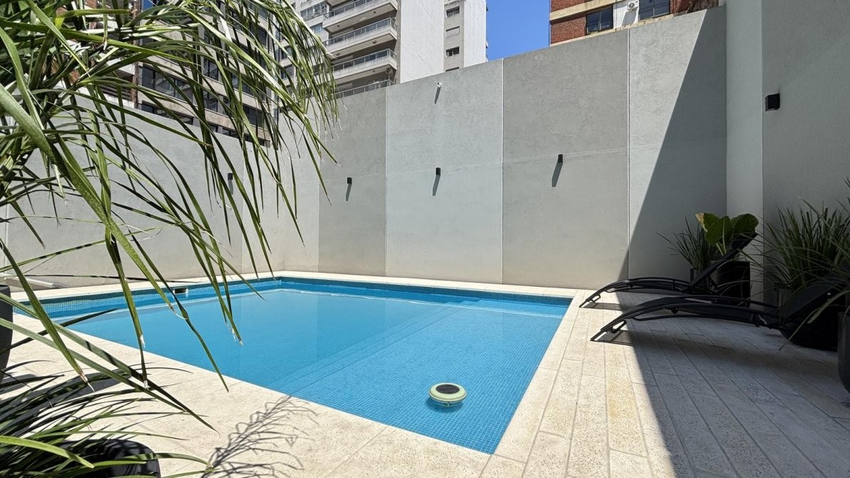 Desde el living y el dormitorio se accede a un balcón corrido con vista abierta a la pileta, que aporta gran luminosidad y una agradable conexión al aire libre.