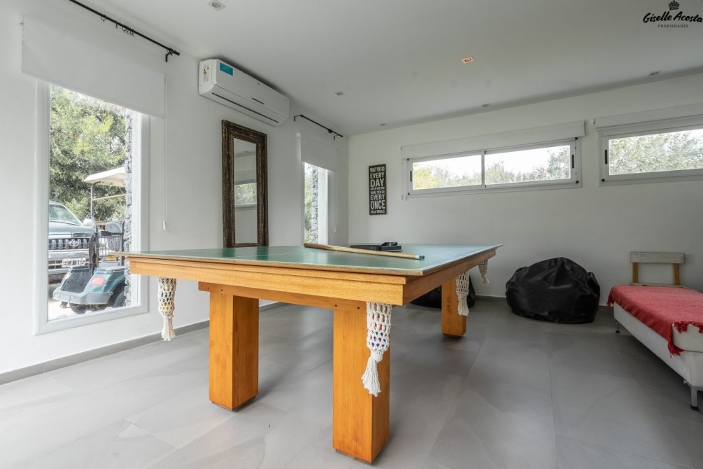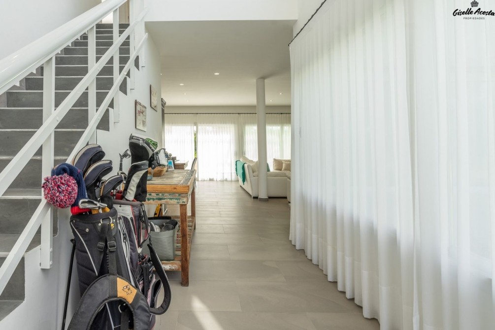 Se comunica hacia el exterior con la galería semicubierta y su vista es a la pileta, el solárium y el fondo del golf.