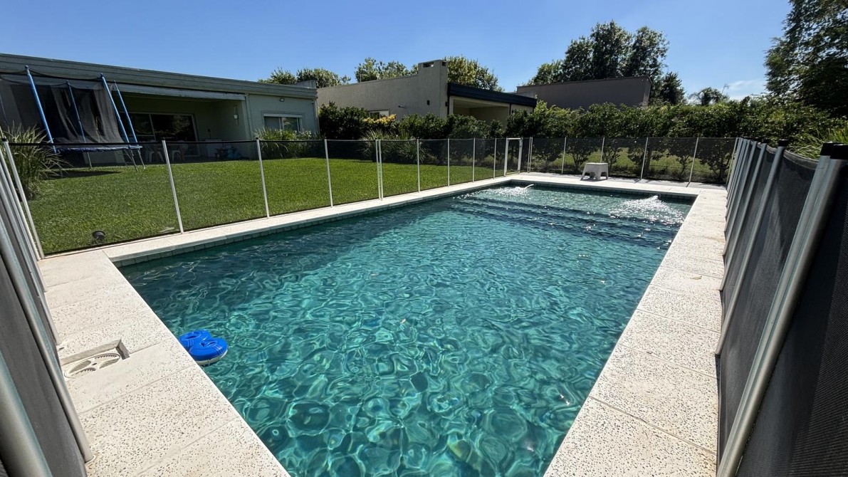 Pileta de calidad Premium con revestimiento en piedra Brazil y con cerco protector para niños, riego automático, jardín parquizado.