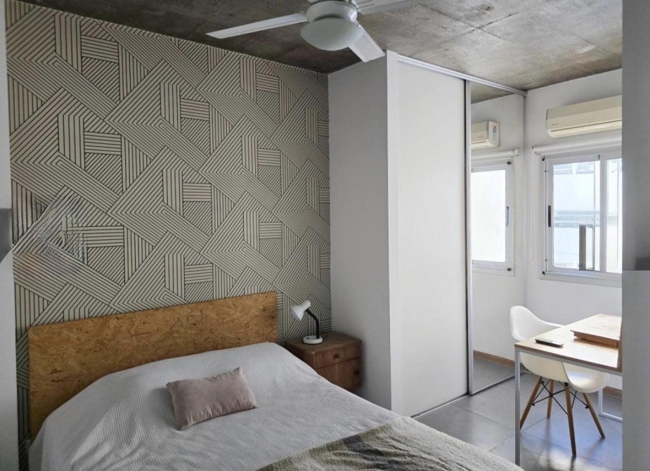 El dormitorio se ubica al contrafrente, brindando tranquilidad y privacidad, con placard de piso a techo y espacio ideal para home office.