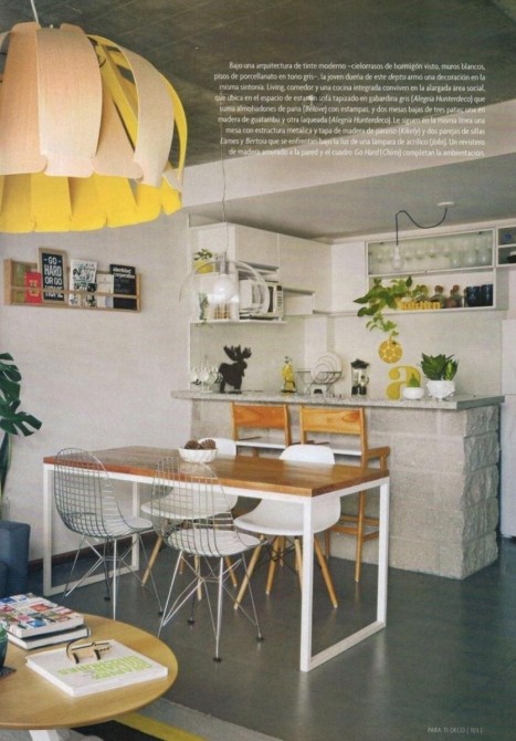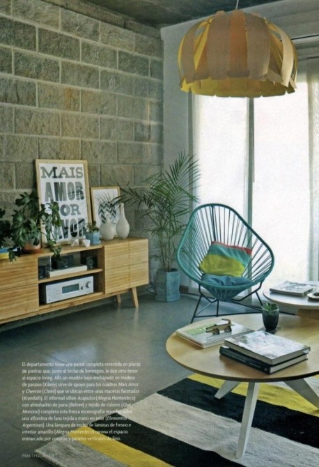 Detalles que marcan la diferencia: techo de hormigón visto, pisos de porcelanato y pared de piedra en living, aportando una estética contemporánea y personalidad única.