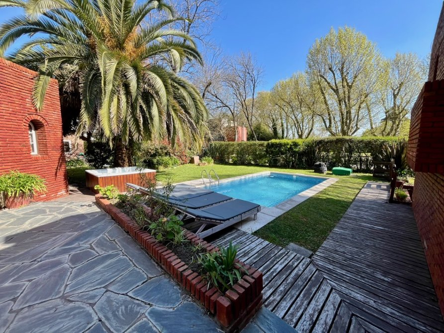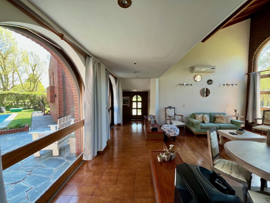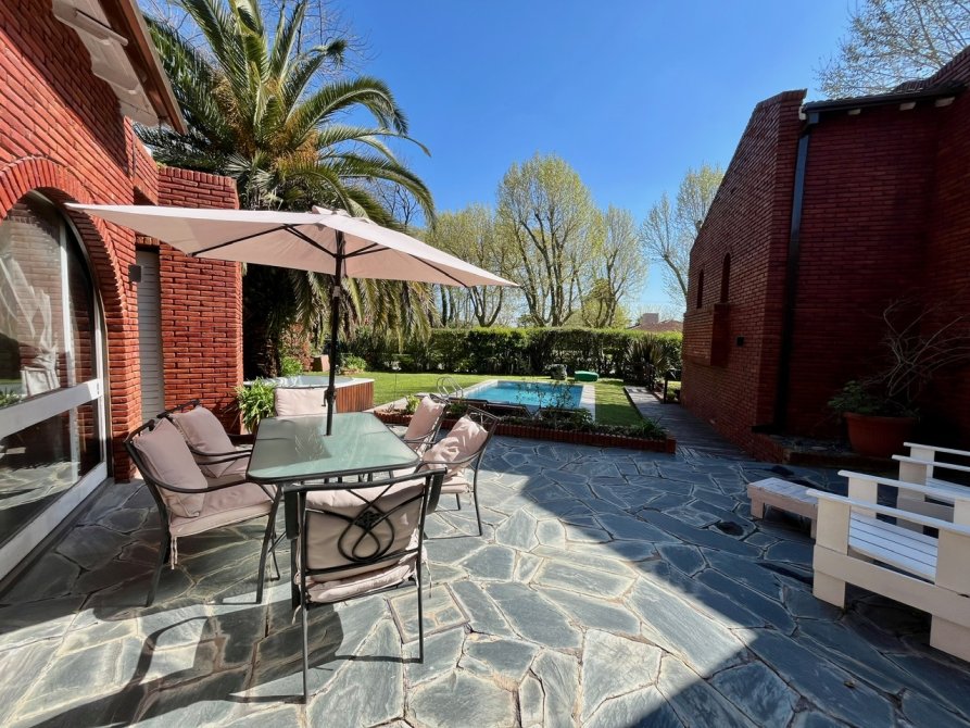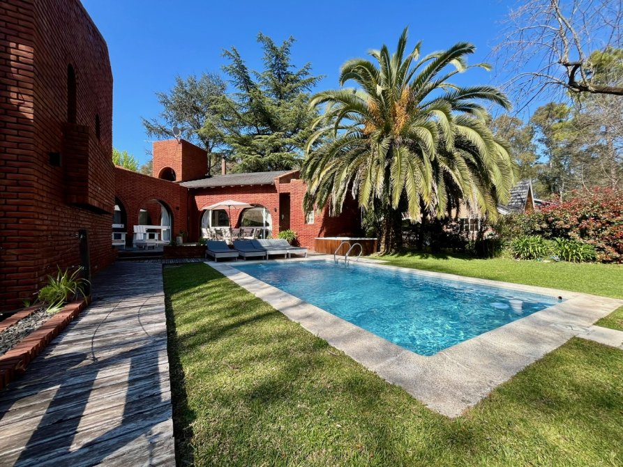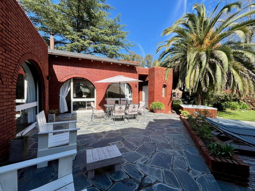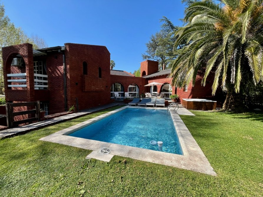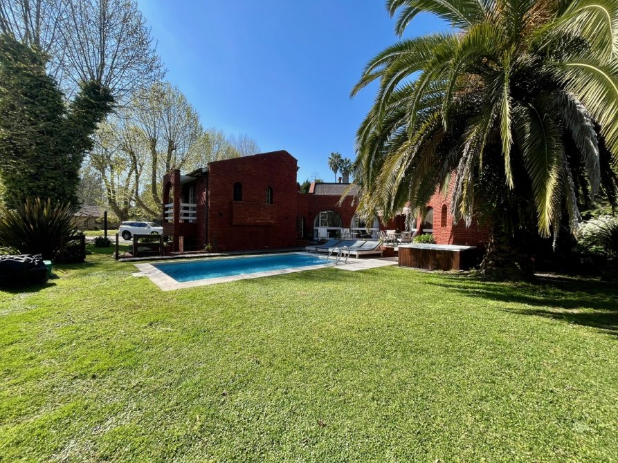 La propiedad consta de un amplio living en desnivel con hogar a leños piso de madera entarugada y grandes ventanales con vista al hermoso parque, con lo cual hace que sea un ambiente muy luminoso, cuenta con un importante comedor diario con parrila y un equipo de aire acondicionado, toilette de recepcion, cocina totalmente equipada con muebles bajo y sobre mesada, lavadero, 5 dormitorios con placard (el principal en suite y vestidor) 3 baños completos, dormitorio y baño de servicio, cochera en subsuelo para 3 autos, parque con piscina climatizada y jacuzzi.