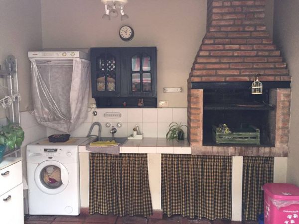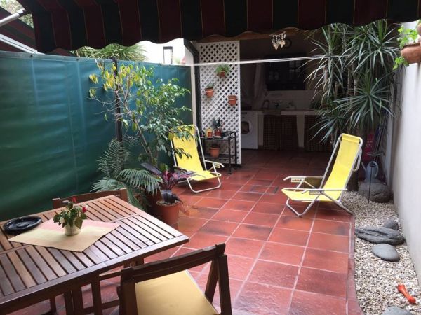 Patio trasero de 8 x 3 mts. con baldosones color cerezo y espacio semicubierto con Lavadero y Parrilla.