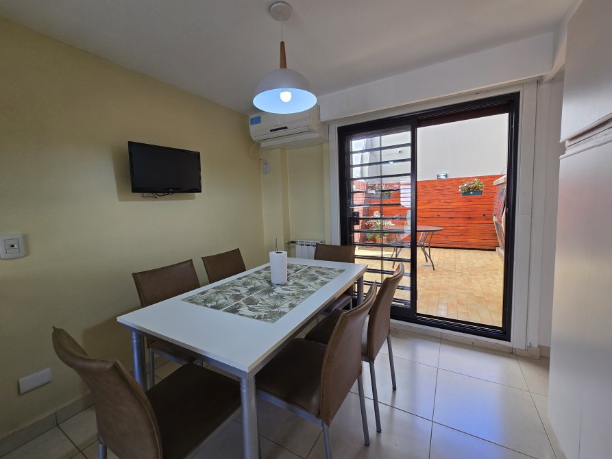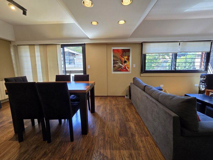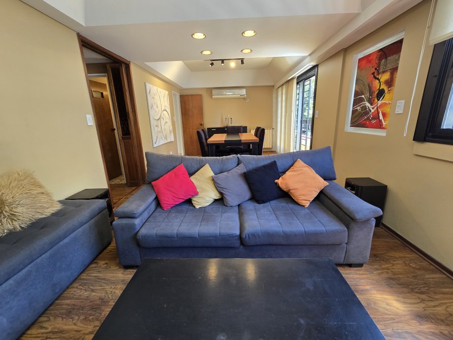 Amplio living comedor con doble circulación, equipado con aire acondicionado frío-calor de 7000 frigorías y salida a un balcón.