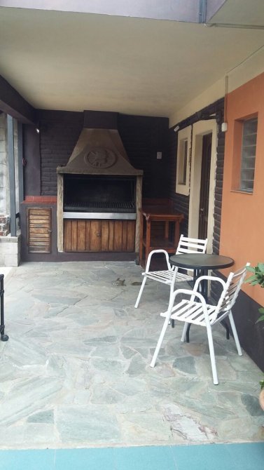 Jardín, chalet con living comedor, tres dormitorios, baño, amplia cocina comedor diario, garage, y quincho con parrilla.