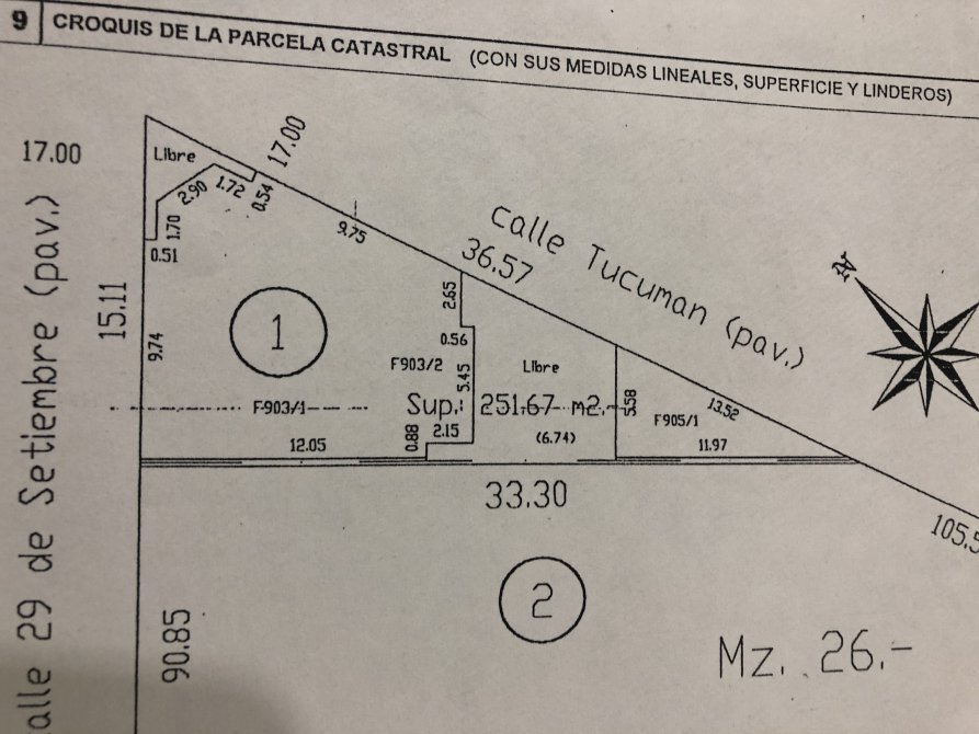 Edificado sobre lote irregular en esquina de 15 mts. de frente x calle 29 de Setiembre y 36 mts. sobre calle Tucuman (haciendo un triangulo)