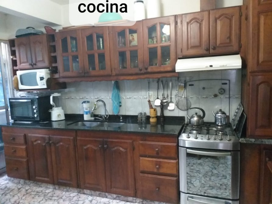 AMPLIA COCINA COMEDOR CON MUEBLES EN MADERA BAJO Y SOBRE MESADA CON SALIDA A PATIO TECHADO CON CUBIERTA METALICA MOVIL