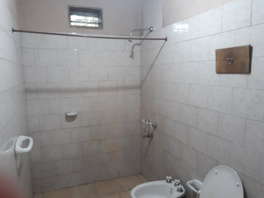 Galeria techada con chapa en patio trasero con un baño pequeño.