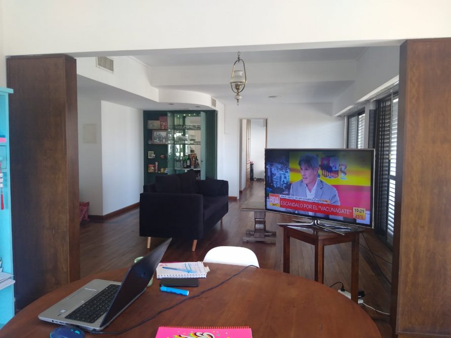 • Living comedor con pisos de madera tarugado, tres ventanales con persianas de metal y toilette.