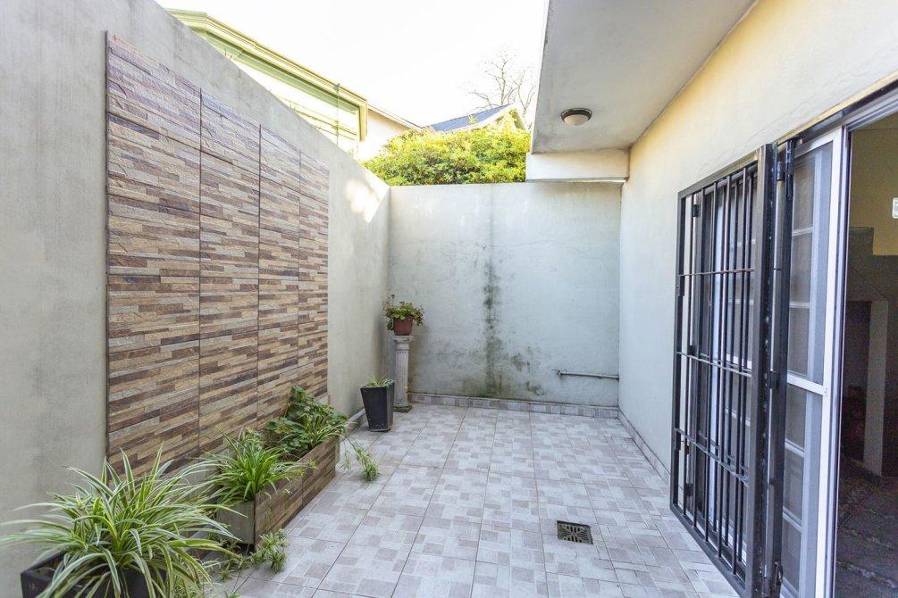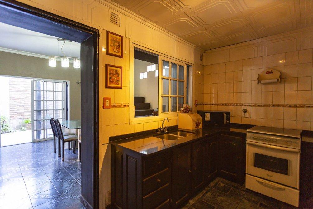 La cocina cuenta con muebles bajo mesada y pasa al comedor diario, un espacio luminoso con doble salida: hacia una galería semicubierta y hacia el patio trasero mediante puertas balcón.