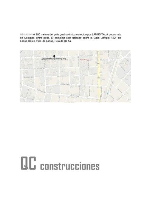 UBICACION A 200 metros del polo gastronómico conocido por LANUSITA, A pocos mts de Colegios, entre otros. El complejo está ubicado sobre la Calle Llavallol 432 en Lanus Oeste, Pdo. de Lanús, Pcia de Bs As.