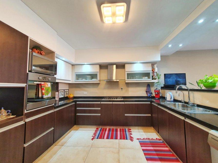 - La cocina comedor posee una gran mesada de mármol en forma "C" con desayunador. Con muebles bajo mesada y alacena. Cuenta con anafe marca "Franke", horno embutido marca "Domec" y grifería monocomando marca "FV".