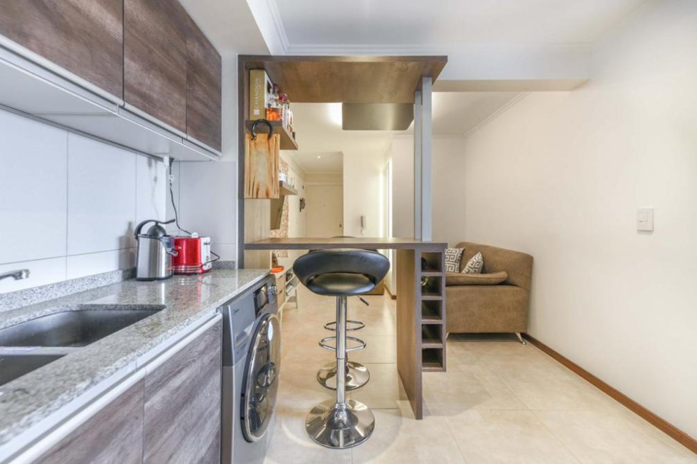 Impecable monoambiente con gran vista y luminosidad. Ubicado en un 7mo piso. Cuenta con: cocina amueblada con mesada de granito; muebles bajo mesada y alacenas; pileta de acero inoxidable; grifería monocomando marca FV; barra desayuandora que divide el living de la cocina; dormitorio con placard, y cajoneras hechos a medida. Además, la vivienda tiene baño completo con bañera y mampara, e incluye una cochera cubierta en el subsuelo con portón automático. El edificio tiene 5 años de antiguedad.