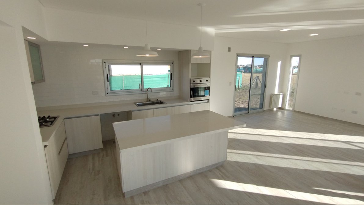 - Hall de recepción, con acceso a hermoso y amplio Living comedor con cocina integrada con isla de mármol y base de madera. La cocina cuenta con mesada de mármol blanco, mueble bajo mesada de madera y alacena. Cuenta con bacha de acero inoxidable, grifería de primera calidad, anafe a gas con extractor de aire empotrado y horno empotrado (eléctrico). Alacena y mueble vertical de madera.