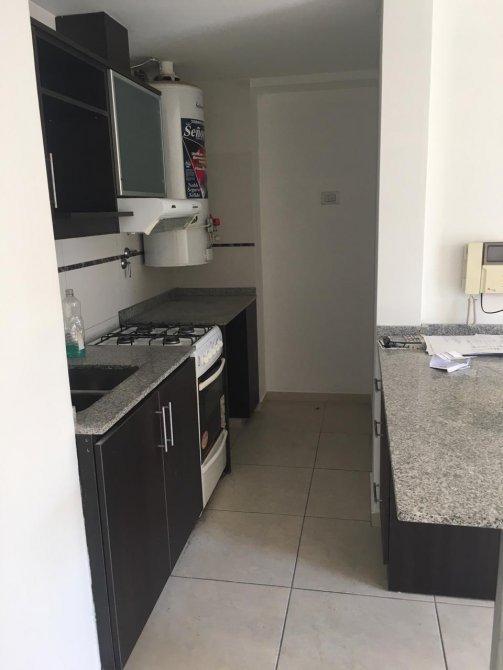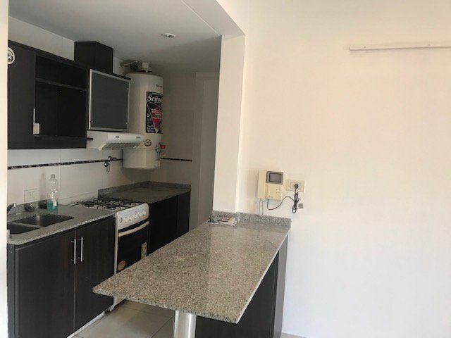 Cocina integrada totalmente equipada, con termotanque, artefacto de cocina y barra desayunadora