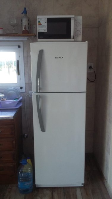 Cocina totalmente equipada: mesa, silla, heladera, microondas, vajilla, utensillos,