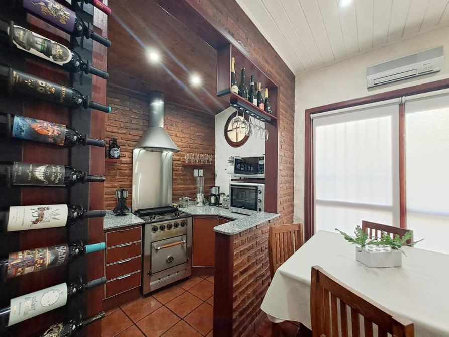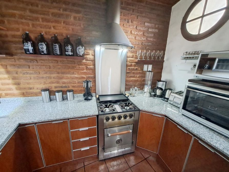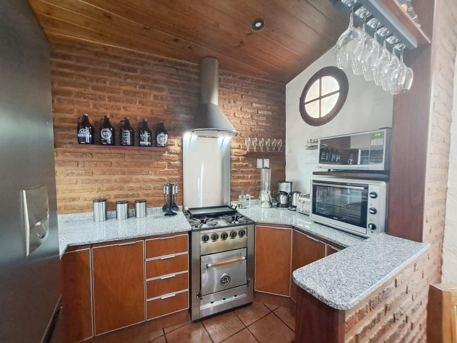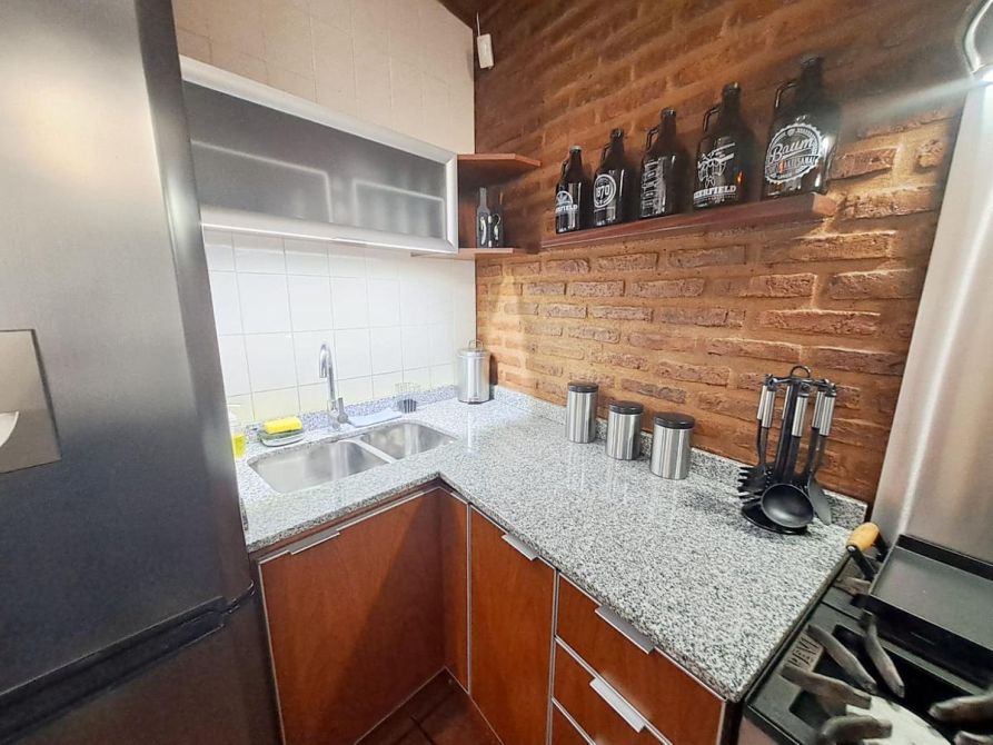 - Cocina y comedor diario con mesadas de mármol granítico, muebles en melamina y aluminio y artefacto de cocina tipo industrial.