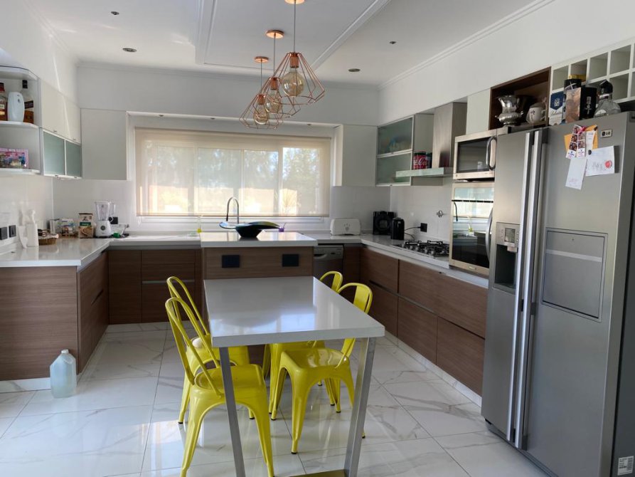 En planta baja cuenta con acceso de auto, cochera cubierta, ingreso a la cocina y comedor diario con muebles de primer nivel, isla central con puerta doble divisoria.