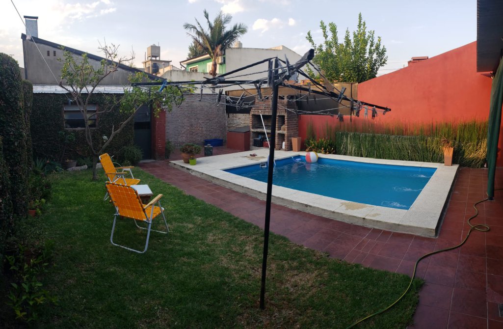 Fondo libre de 8,66 m x 12,90 m con galería de 8,66 m x 2,80 m, hermosa piscina de 5 m x 3,50 m, parrilla y galpón de guardado de 4 m x 2 m;