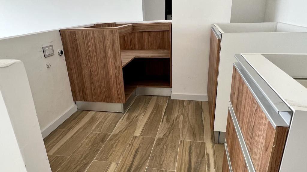 Cocina integrada con alacenas, bajo mesada, mesada en silestone.