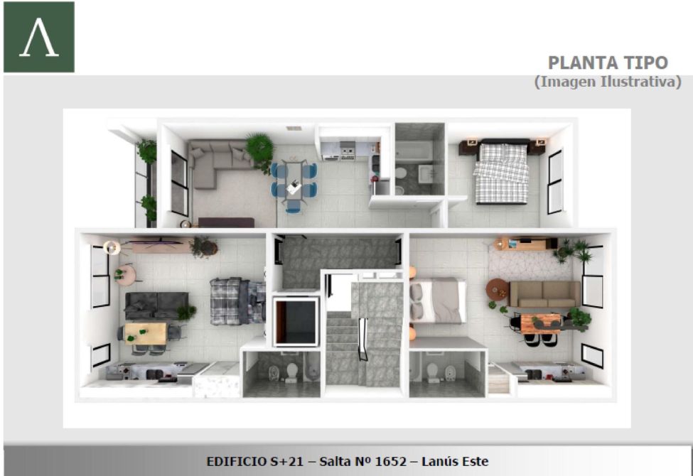 14 unidades de 1 ambiente de 34 m2, de las 7 unidades con tipologías “A”, y 7 unidades tipología “B”