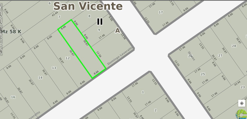 VENDO 6 LOTES EN SAN VICENTE, (PARCELAS 11 A LA 16) EN ZONA EN DESARROLLO, SOBRE CALLE DOMINGO LEVERATTO, TIENEN 8.66 MTS DE FRENTE X 30,87 MTS DE FONDO CADA UNO, EL VALOR PUBLICADO ES POR CADA UNO, CUENTAN CON CESION DE DERECHOS Y ACCIONES POSESORIAS CERTIFICADA ANTE ESCRIBANO PUBLICO DESDE EL AÑO 2013, Y PLANO DE MENSURA QUE PRETENDE PREESCRIBIR
