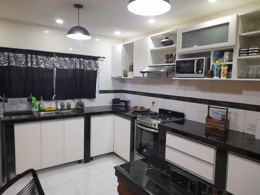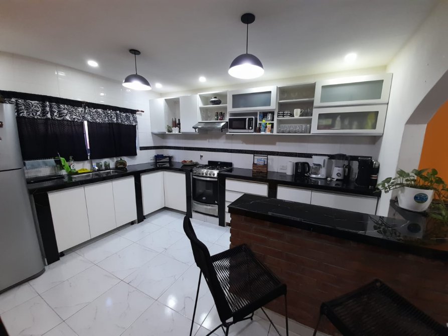 -Cocina con barra, (la cocina amoblada en blanco con mesada en color negro)