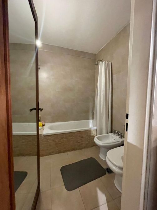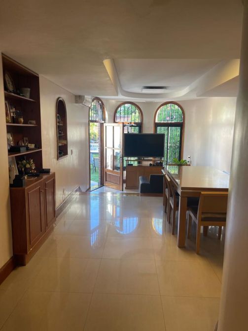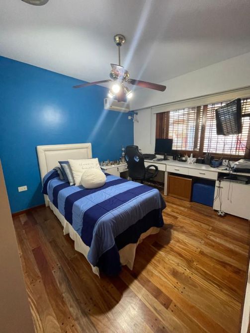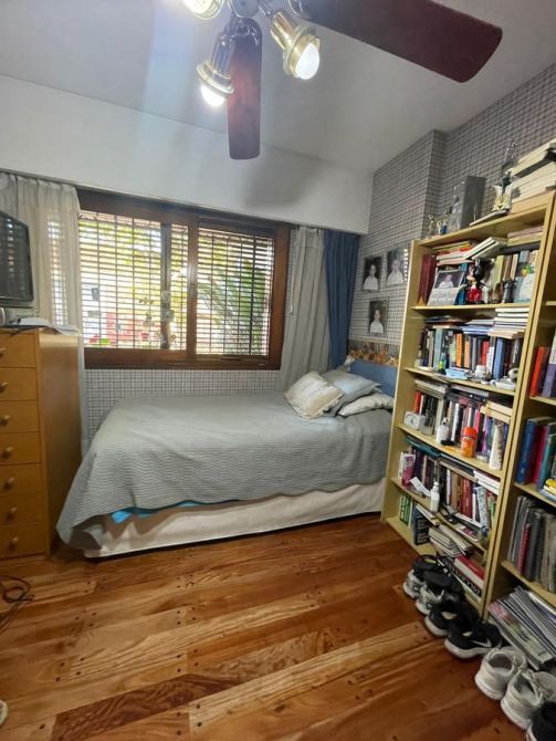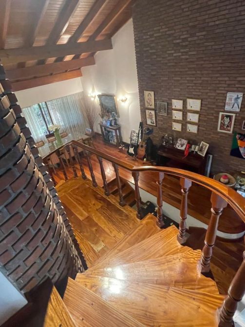 En la parte de atrás: Amplio quincho vidriado con aire acondicionado y vista al parque con cocina completa con alacena y bajo mesada, isla, parrilla y baño con ducha.    EXCELENTE ESTADO,  MUY BUENA CONSTRUCCION.