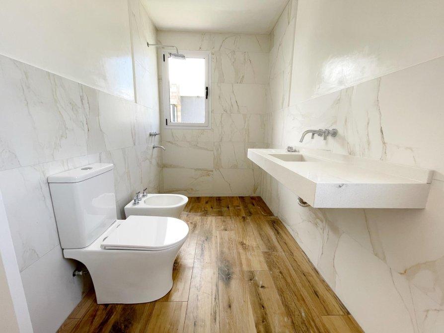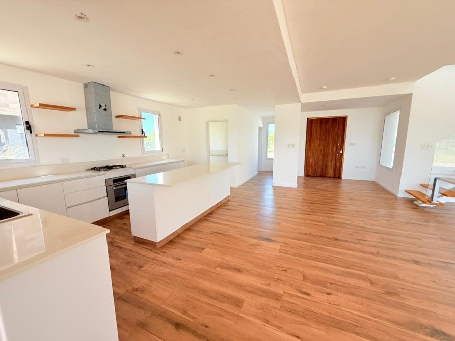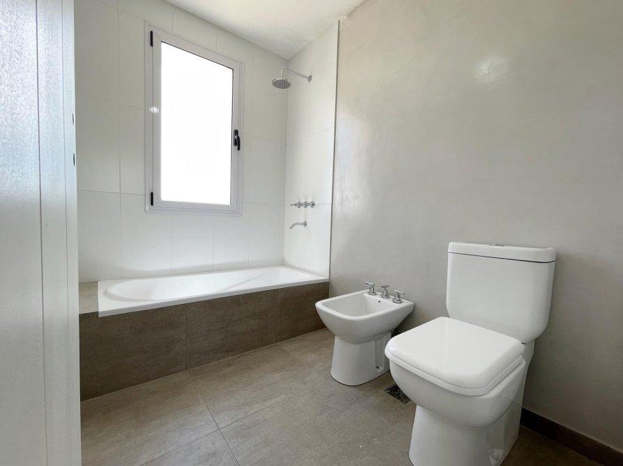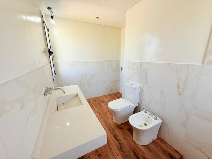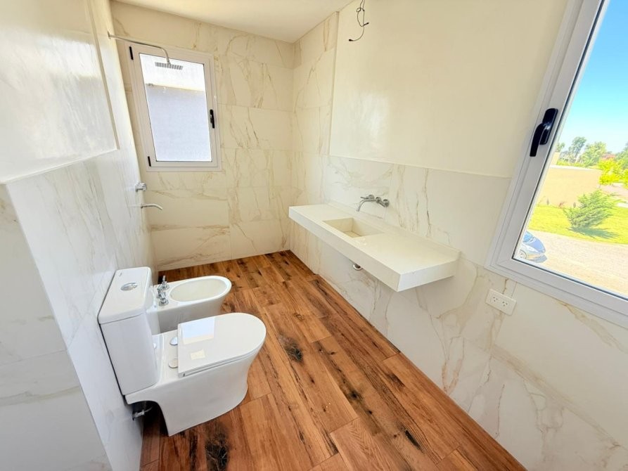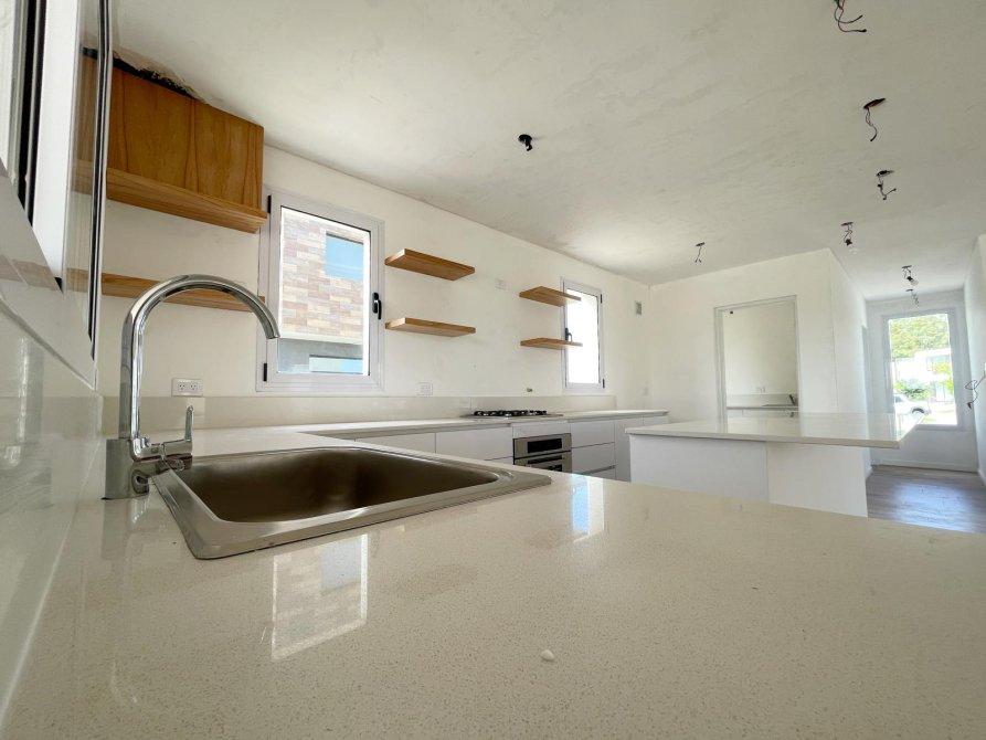 Generalidades: Sistema de calefacción por piso radiante con caldera dual (marca PEISA o similar) con 2 termostatos, uno ubicado en P.B y otro en P.A. Agua caliente sanitaria por caldera dual de 1ra. Marca (gas/electricidad). Instalación preparada con bypass para recibir termo tanque. Pre kit de instalación para A.A en todos los ambientes. Carpintería de aluminio blanco exterior e interior a medida de alta calidad. Vidrio DVH en todos los ambientes. Piso de porcelanato simil madera de alta calidad y Zócalos de PVC. Paredes y cielorrasos con buña perimetal en todos los ambientes de yeso proyectado. Frentes e interiores de placard completos. Puertas interiores blancas con marco de chapa, Puerta de entrada en madera. Muebles de lavadero, cocina e isla bajo mesada a medida, Mesada blanco paloma de cuarzo y bacha de acero inoxidable en cocina. Hornos (eléctrico), anafe (a gas) de primera calidad y campana, marca TST o similar, última generación. Baño gral en P.A con bañadera, el resto de los baños con ducha. Revestimiento solo en ducha, el resto de las paredes de los locales húmedos llevaran microcemento en paredes, salvo el baño en suite que el revestimiento será hasta la mitad de la pared en todo su perímetro. Vanitorys en blanco paloma de cuarzo. Artefactos sanitarios marca “PRINGLES”, color blanco y griferias de primera calidad. Revestimiento plástico exterior con detalles de piedra.