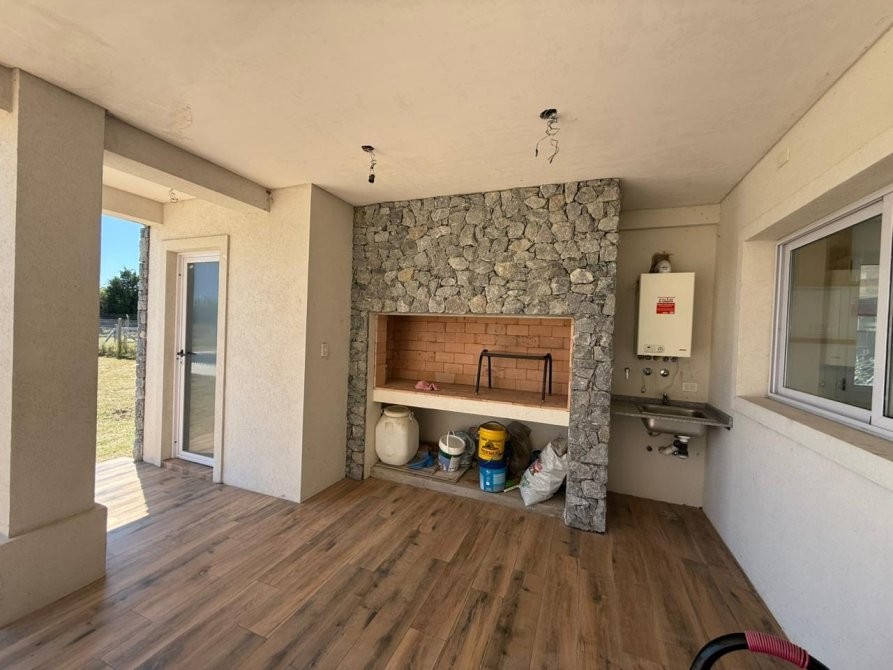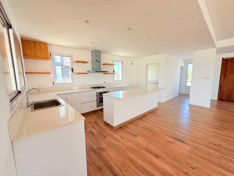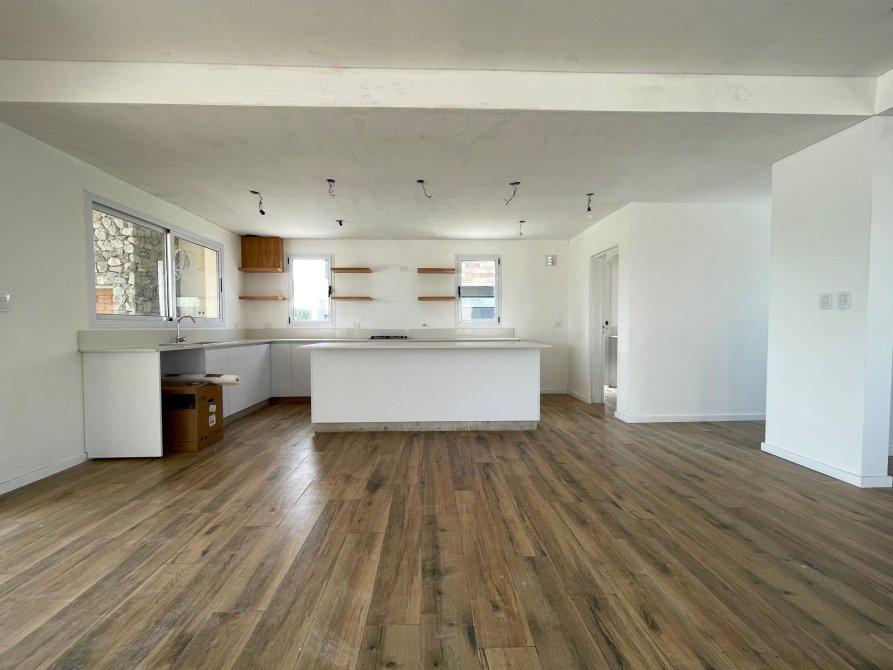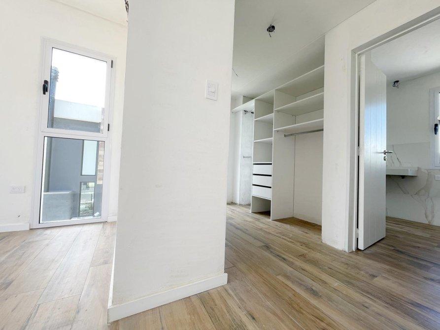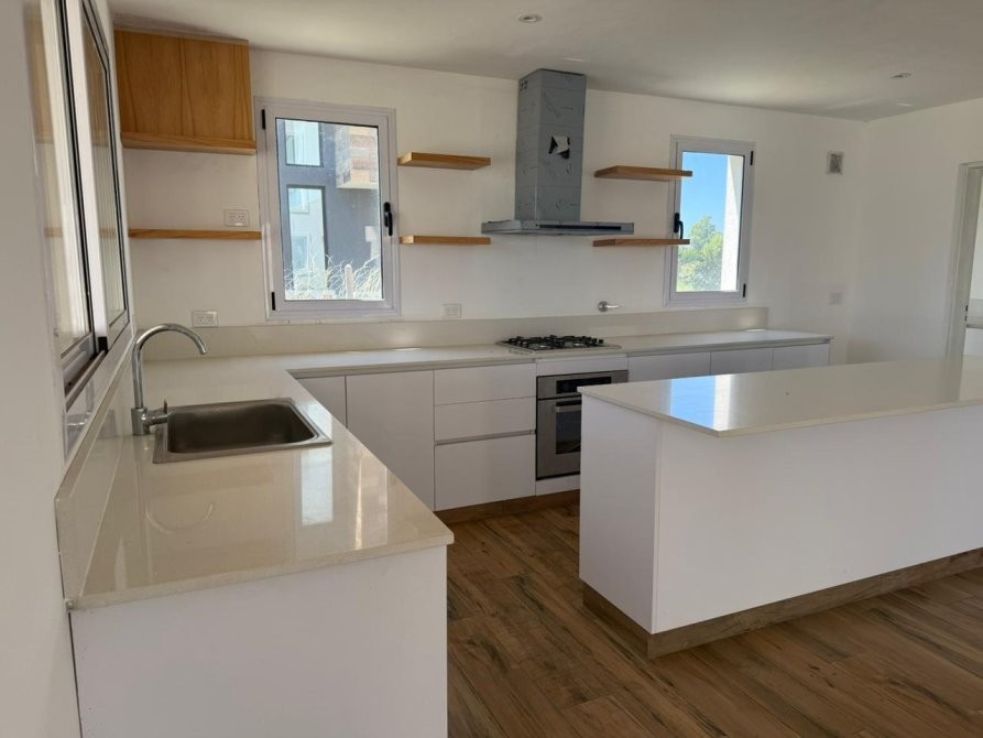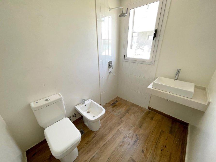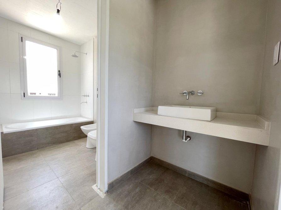 Generalidades: Sistema de calefacción por piso radiante con caldera dual (marca PEISA o similar) con 2 termostatos, uno ubicado en P.B y otro en P.A. Agua caliente sanitaria por caldera dual de 1ra. Marca (gas/electricidad). Instalación preparada con bypass para recibir termo tanque. Pre kit de instalación para A.A en todos los ambientes. Carpintería de aluminio blanco exterior e interior a medida de alta calidad. Vidrio DVH en todos los ambientes. Piso de porcelanato simil madera de alta calidad y Zócalos de PVC. Paredes y cielorrasos con buña perimetal en todos los ambientes de yeso proyectado. Frentes e interiores de placard completos. Puertas interiores blancas con marco de chapa, Puerta de entrada en madera. Muebles de lavadero, cocina e isla bajo mesada a medida, Mesada blanco paloma de cuarzo y bacha de acero inoxidable en cocina. Hornos (eléctrico), anafe (a gas) de primera calidad y campana, marca TST o similar, última generación. Baño gral en P.A con bañadera, el resto de los baños con ducha. Revestimiento solo en ducha, el resto de las paredes de los locales húmedos llevaran microcemento en paredes, salvo el baño en suite que el revestimiento será hasta la mitad de la pared en todo su perímetro. Vanitorys en blanco paloma de cuarzo. Artefactos sanitarios marca “PRINGLES”, color blanco y griferias de primera calidad. Revestimiento plástico exterior con detalles de piedra.