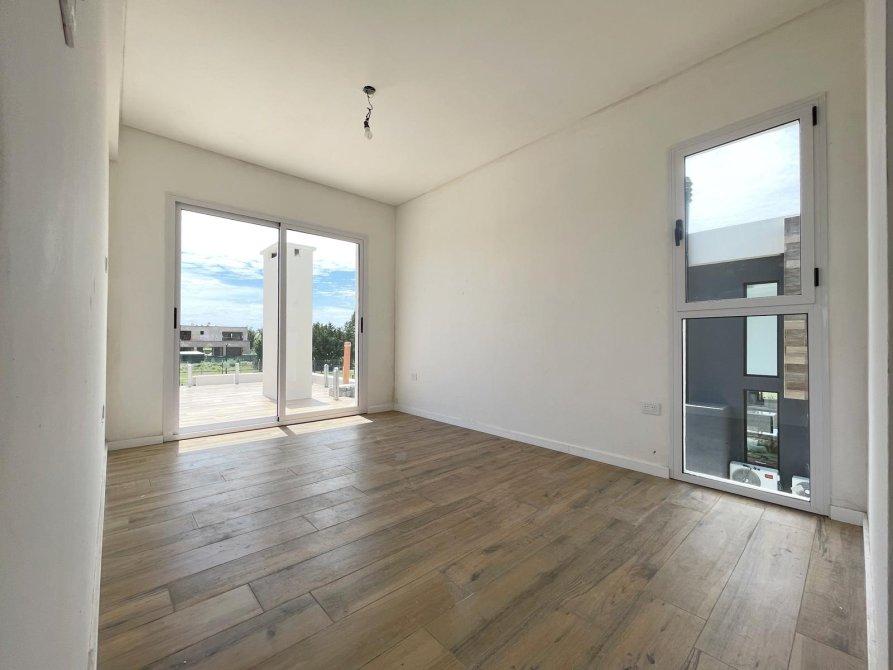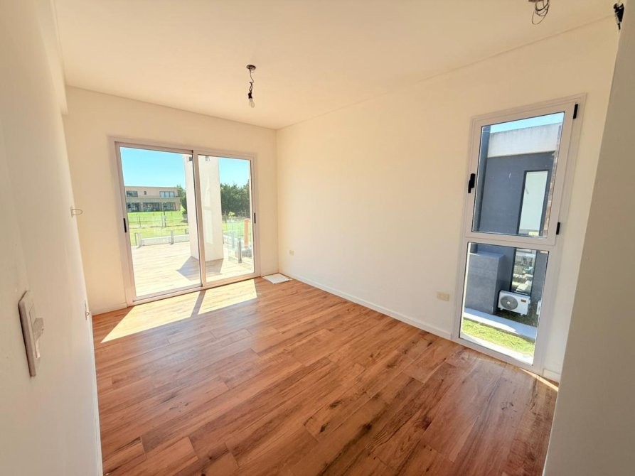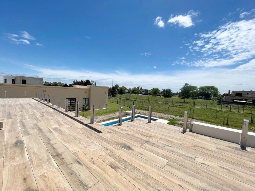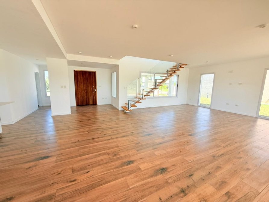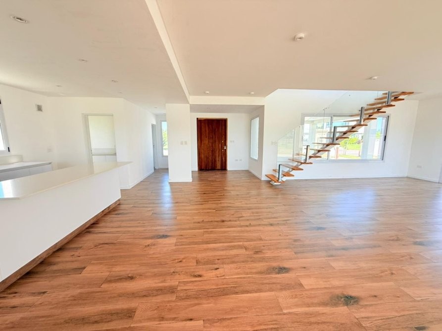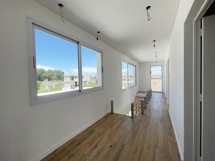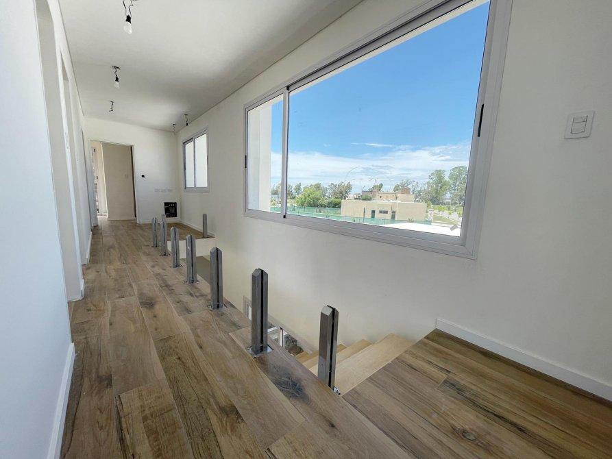 PA: Escalera metalica con escalones de madera, baranda de acero y vidrio. Amplio espacio de escritorio con vistas abiertas a la laguna, dos cómodos dormitorios con placar, baño completo con ante baño, Dormitorio principal en suite con vestidor. Todos los dormitorios con vista al jardín y salida gran terraza de 53.76 mts² con cierre de acero y vidrio.