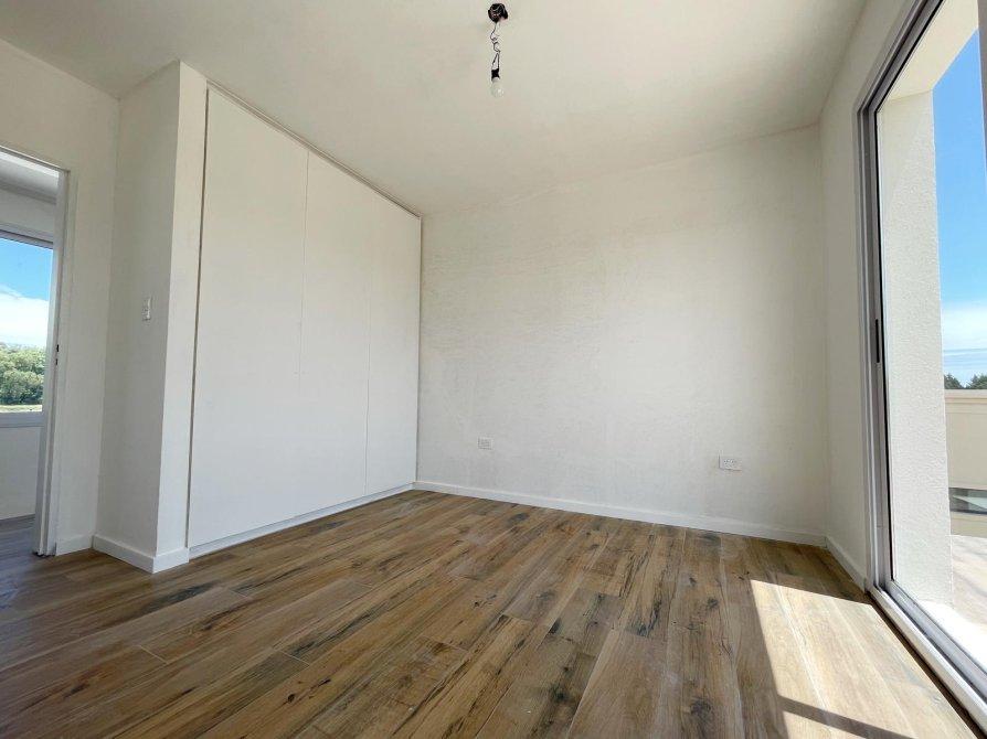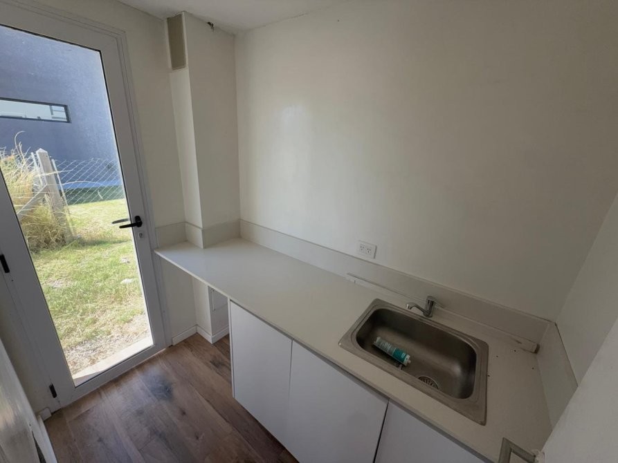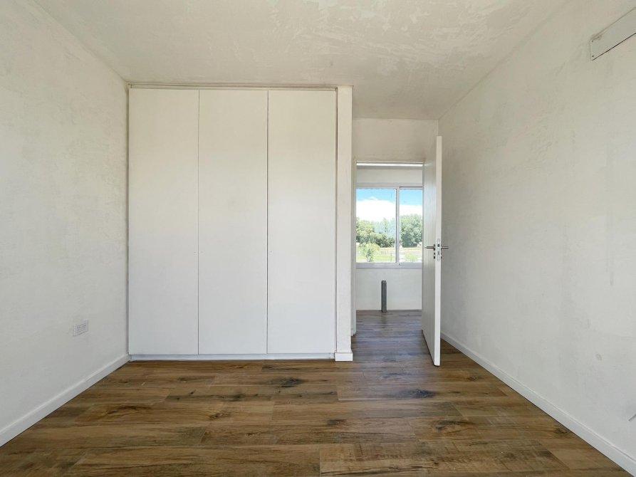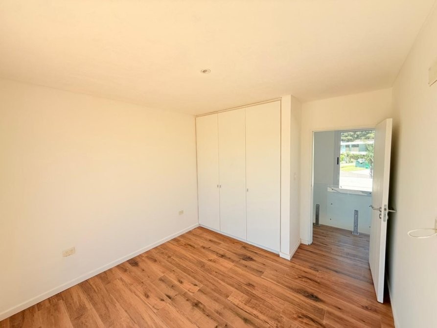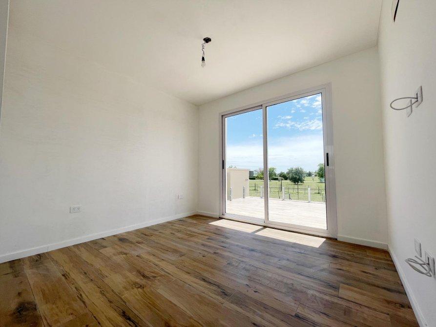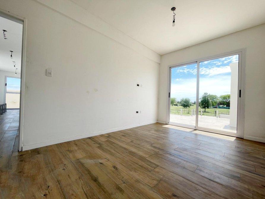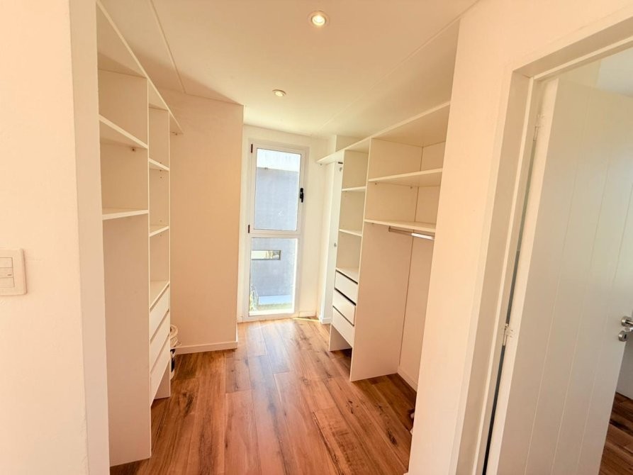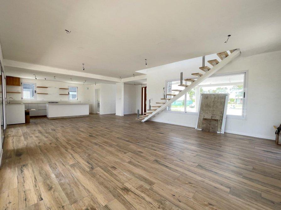 PA: Escalera metalica con escalones de madera, baranda de acero y vidrio. Amplio espacio de escritorio con vistas abiertas a la laguna, dos cómodos dormitorios con placar, baño completo con ante baño, Dormitorio principal en suite con vestidor. Todos los dormitorios con vista al jardín y salida gran terraza de 53.76 mts² con cierre de acero y vidrio.