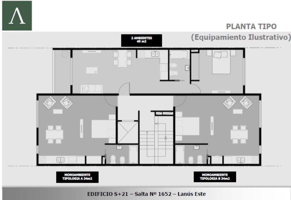 Contará con 49m2 distribuidos en living comedor con balcon al frente de 4.70 x 3.20 mts., cocina integrada de 2.25 x 2.20 mts., dormitorio al contra frente de 3.80 x 3.20 mts.  y baño de 1.50 mts. x 2.20 mts.