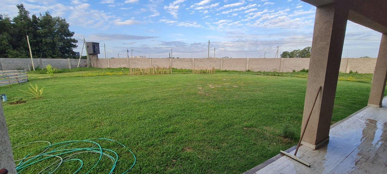 La casa cuenta con una cochera semi cubierta al frente, lo suficientemente amplia para albergar dos vehículos. Además, cuenta con un extenso parque de 800m2 que se extiende hasta los espacios de servidumbre del barrio.