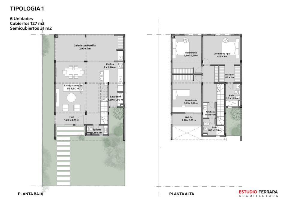 CANNING PARC cuenta con 42 unidades de dos tipologías diferentes, 6 unidades de 3 dormitorios y 3 baños (158 M2), 36 unidades de 2 dormitorios y 2 baños (85 M2), todas las unidades en 2 plantas.