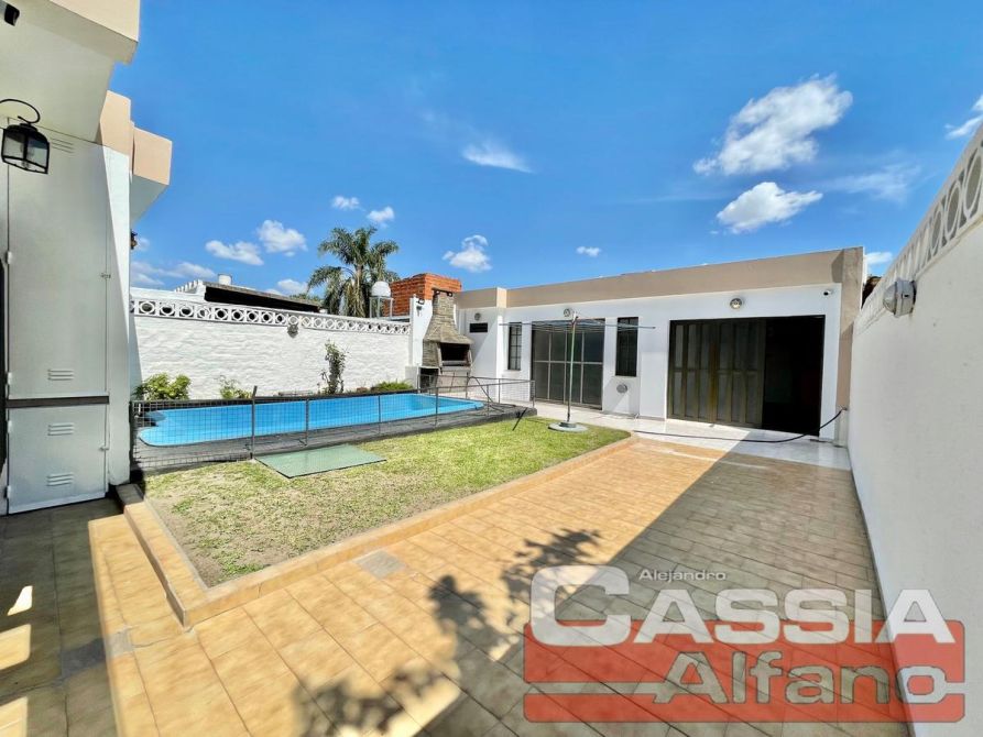 Todos los cerramientos de calidad, con excelente ingreso aire/luz natural al noroeste y vista al parque trasero, con galería semi cubierta lateral, tres toldos independientes de aluminio rebatibles con su sistema funcionando perfectamente. PATIO y HERMOSA PISCINA de fibra con espejo de agua de 5m x 3m aprox. con su sistema de filtrado automático oculto subterráneo, profundidad decreciente, la piscina posee en todo su perímetro baldozones ATERMICOS y enrejado de seguridad para niños, PARRILLA con muy buena salida y tiraje, QUINCHO amplio cerrado pisos graníticos, con baulera de alto super amplia y baño independiente completo con ducha, conexión de gas natural todo equipado con cocina, espacio para lavarropas, mesada con bacha muy cómodo. COCHERA pasante PARA 5 VEHICULOS doble portón hierro. Baulera de guardado sector piscina, PATIO libre pisos cerámicos y espacio verde mucho sol y vista libre perimetral.
