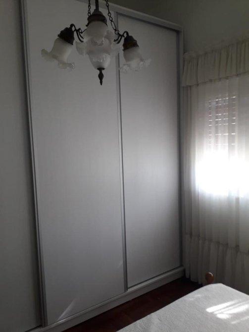 Dormitorio con pisos de parquet y placard empotrado con interiores, ventana con vista a la calle.