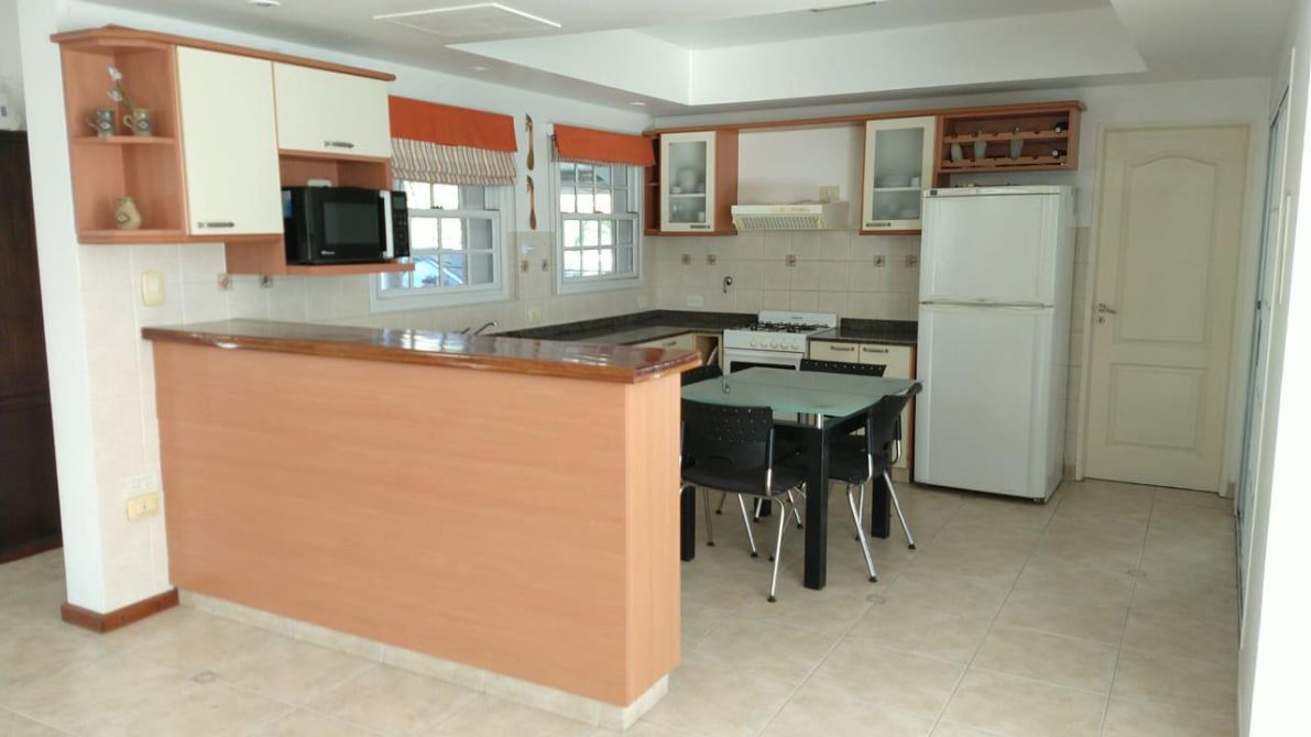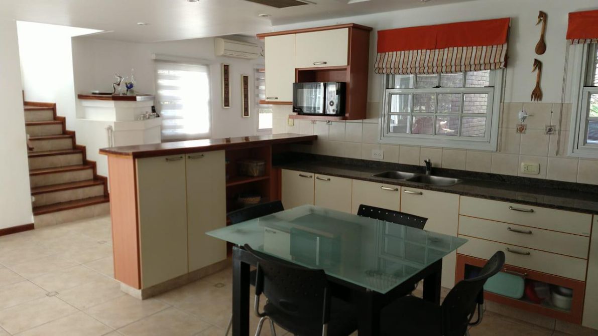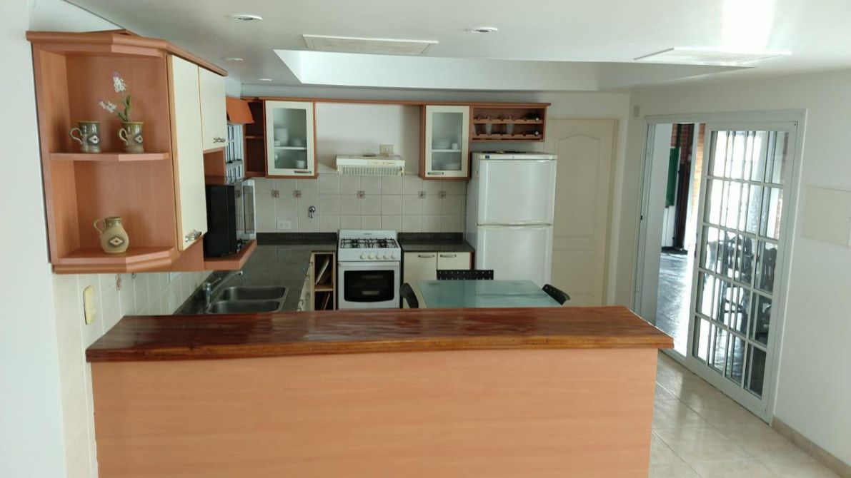 - Galería cerrada en L, amplia parrilla con puerta corrediza, brasero, mesada con bacha y mueble bajo mesada. También cuenta con apertura frontal plegable para guardar vehículo